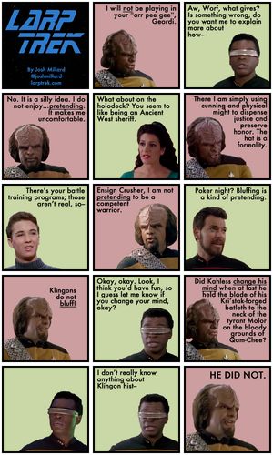 them: UM CANONICALLY WORF DID NOT TRY THE OLD WEST PROGRAM UNTIL SEASON SIX WHEN THIS TAKES PLACE PRIOR TO THAT POINT. THIS MAKES YOUR WHOLE COMIC INCORRECT AND THEREFORE NOT FUNNY.