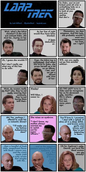 Hey, it’s been a while since we had the whole cast in one strip! Everybody but Worf, of course; he’s practicing some Klingon opera in his room, being extra loud because he secretly hopes someone will notice and check in on him because he’s kind of upset that everybody’s playing the game and too busy to hang out.