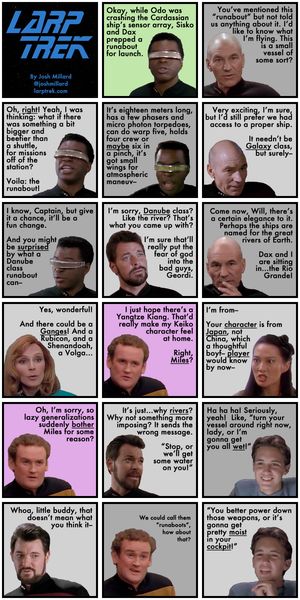He was bored at some point in let’s say season two, he was doodling on a PADD, and this thing is what he came up with. He pulled out the old sketches when setting up this game for the crew and polished things up a bit. (But how could Geordi make it up for DS9 if it showed up in season 6 of TNG? Remember the golden rule of Larp Trek handwaving: if it hasn’t happened yet by most of the way through season three, it hasn’t happened. Anything that contradicts this is a coincidence or something Q did. Carry on.)